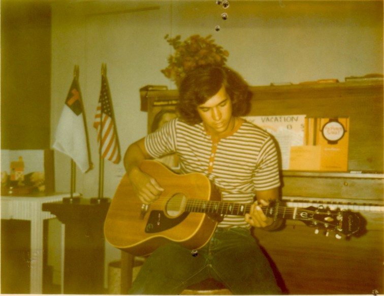 I was part of a band, back in Gridley. We had decided we’d all work that Summer and buy better instruments for when we got back together in the Fall. I was supposed to buy a nice electric guitar, but fell in love with an Epiphone acoustic and bought it instead. I named it ‘Angie’.
